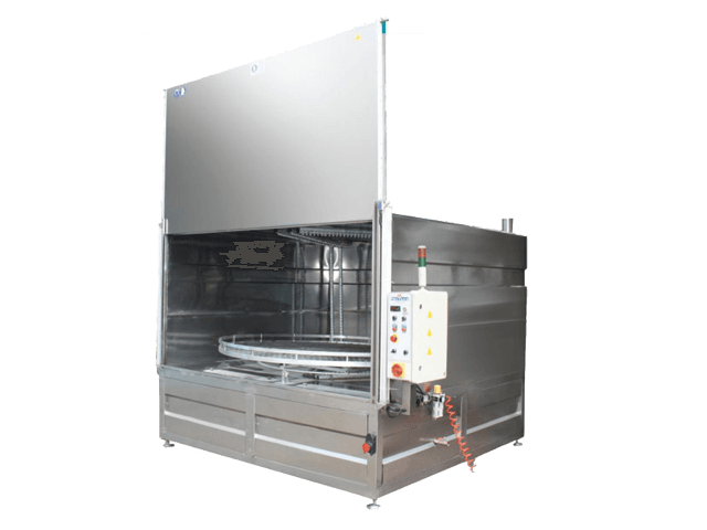 Parts to be cleaned are placed in the rotating basket using a sliding system.